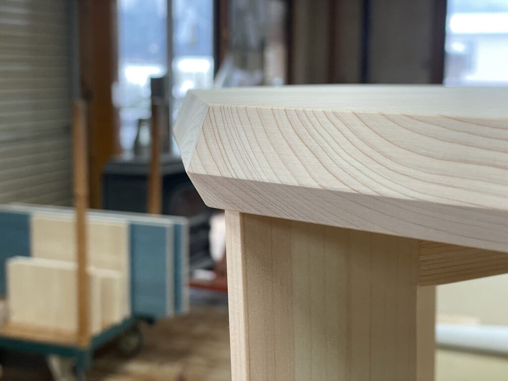 宝石のように多面体にカットされた座面は、光を受ける度に表情を変え、無垢材の美しさを際立たせます。