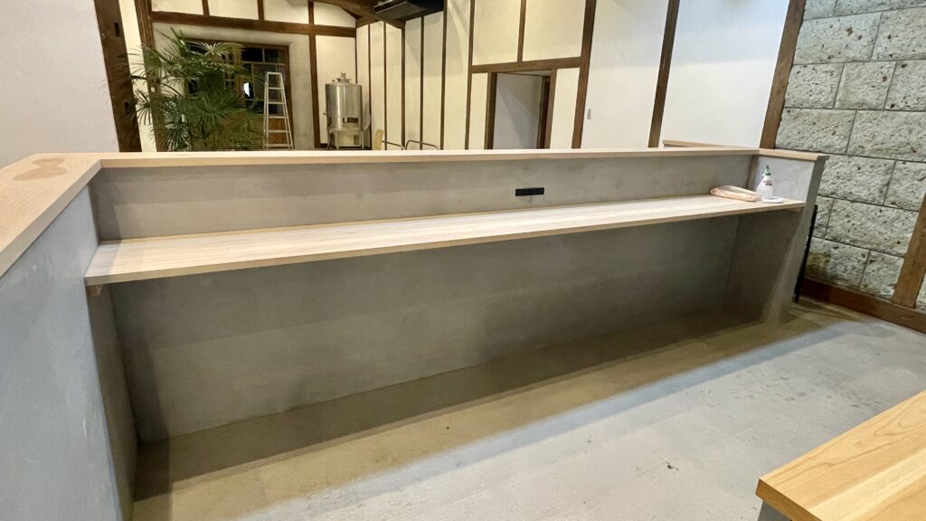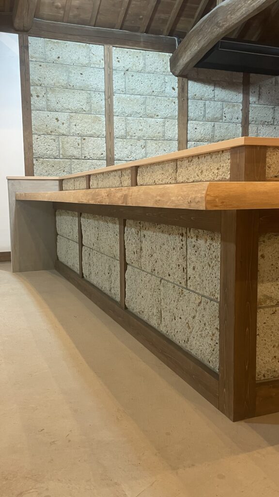 デザインはステンレスと加子母の桧で統一させ、カウンターの外側は壁面と合うよう大谷石と6mのカバ材一枚板を使用。