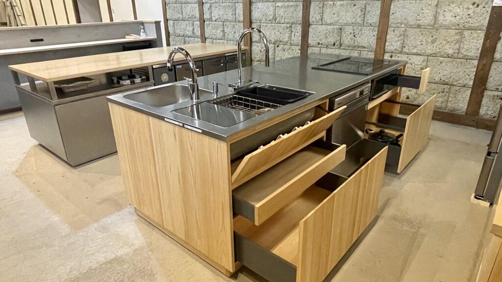 壁面が石貼のため壁面収納は作らず、全て作業・調理台下に設けた。